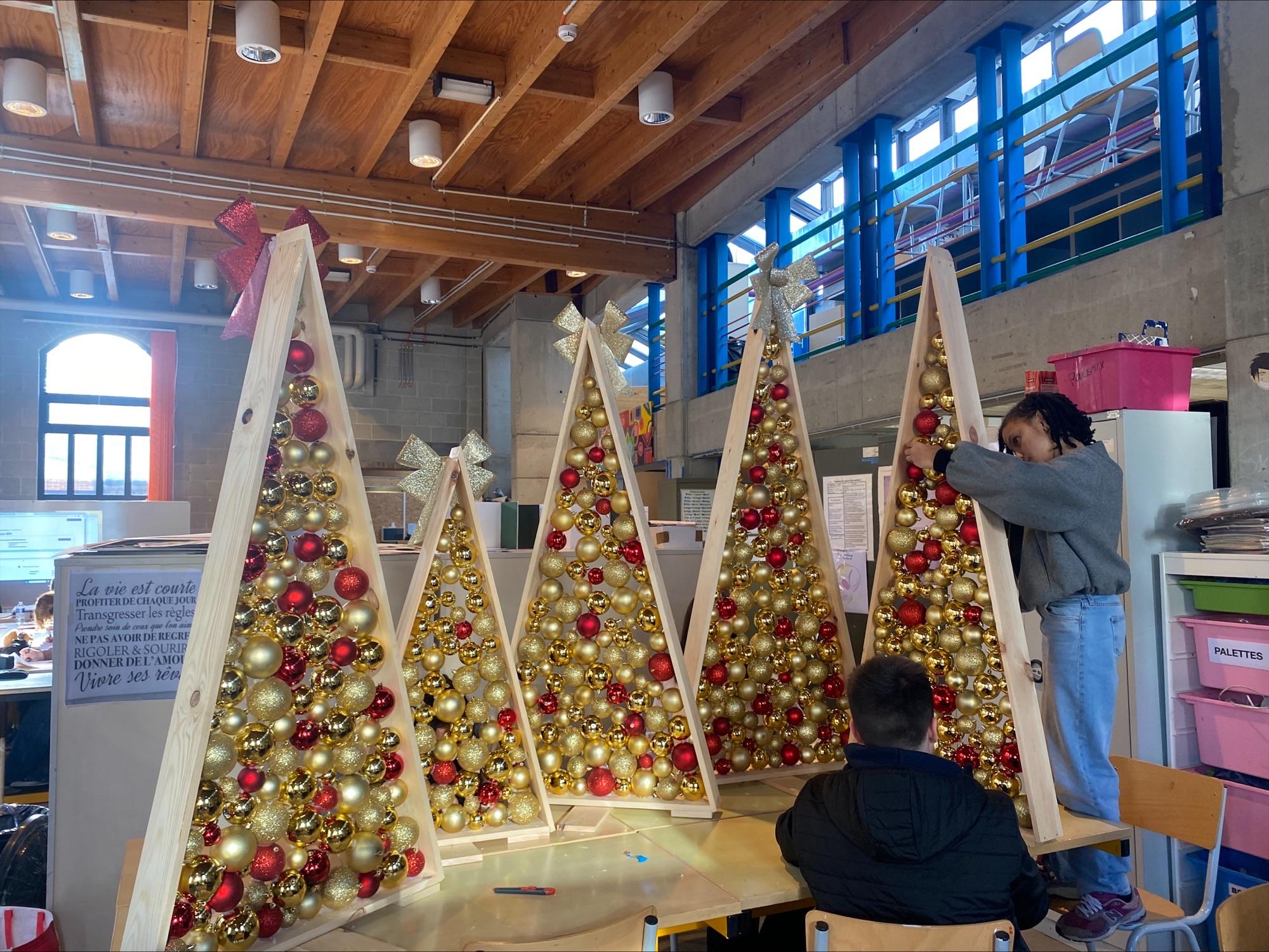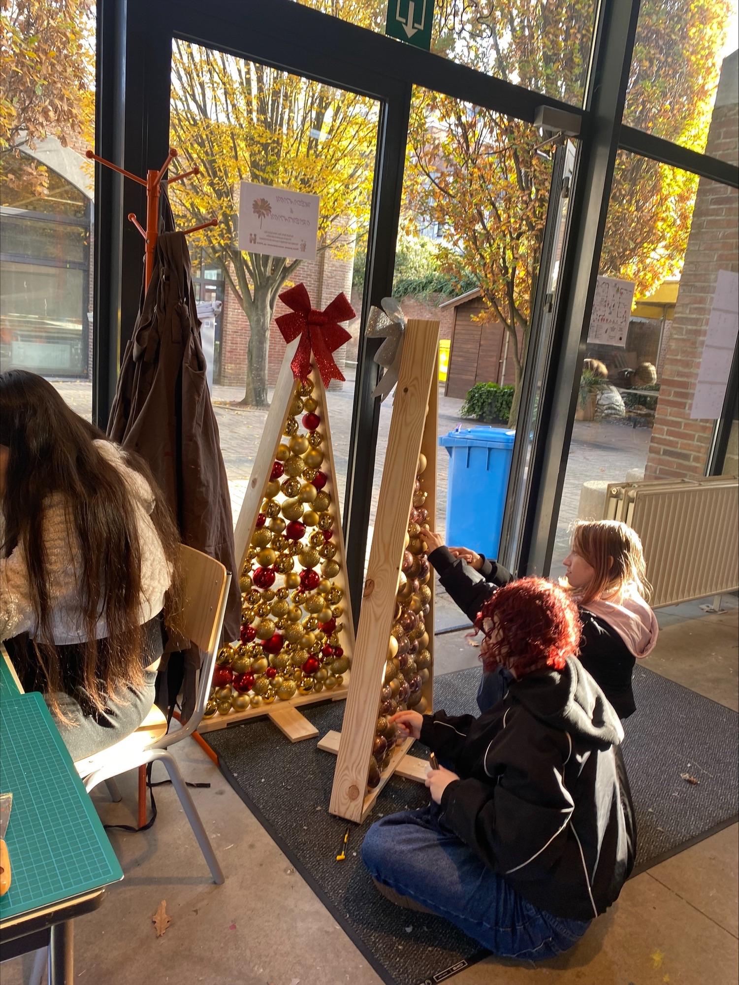 création de maisonnettes enneigées au cours de monsieur Naniot (4TQ arts plastiques ) , stickers chez Madame Sonveau (4TQ arts plastiques), livres objets chez Madame Lamy (6TQ arts plastiques), sapins lumineux et photophores en papier chez Madame Reginster et Van Malleghem (4P assistant en décoration /4P assistant aux métiers de la publicité) , boules en tissu chez Mme Raone (3P arts appliqués) et reportage photo chez monsieur Vranken (4TQ technicien en photographie).