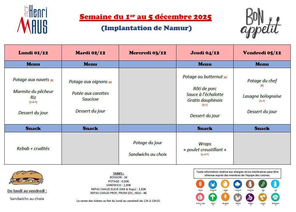 Menu de la semaine du restaurant Henri Maus Repas de la semaine du 1er au 5 décembre 2025 Place de l’Ecole des Cadets 4, 5000 Namur