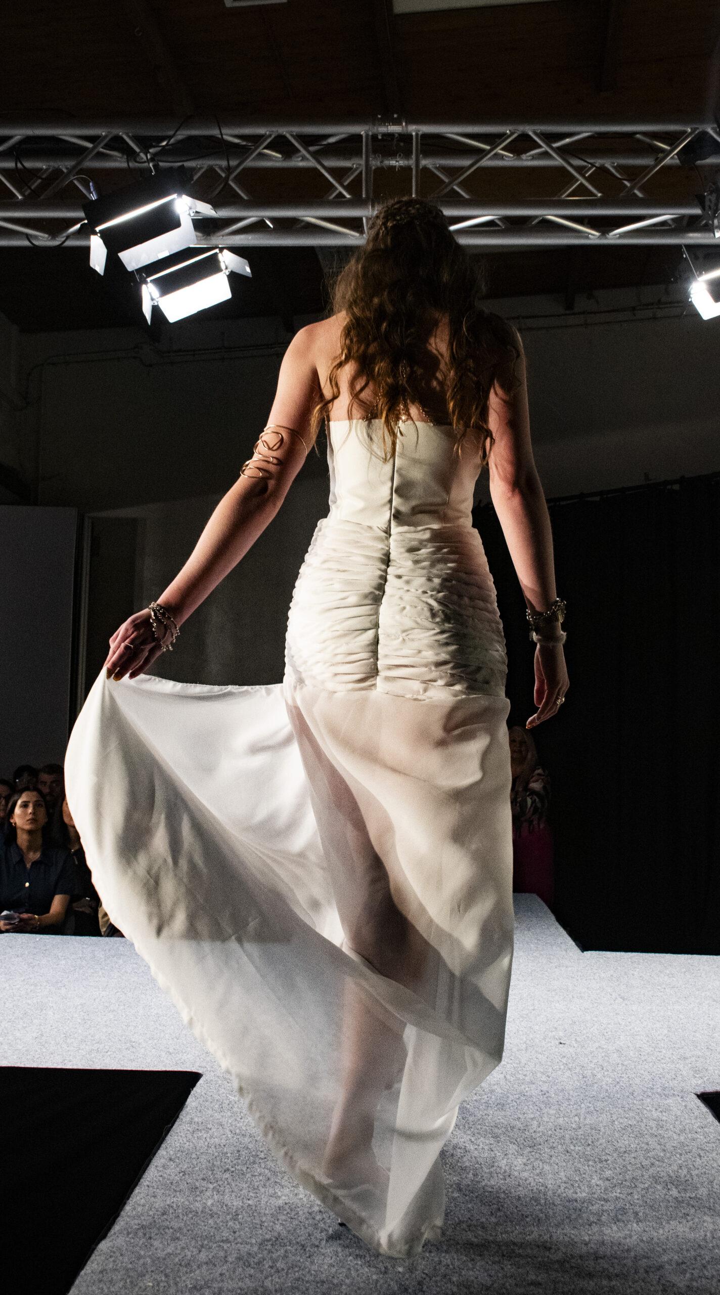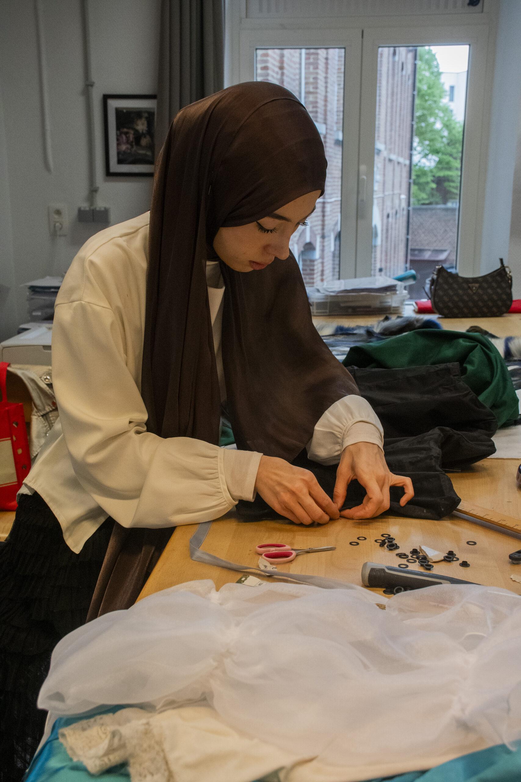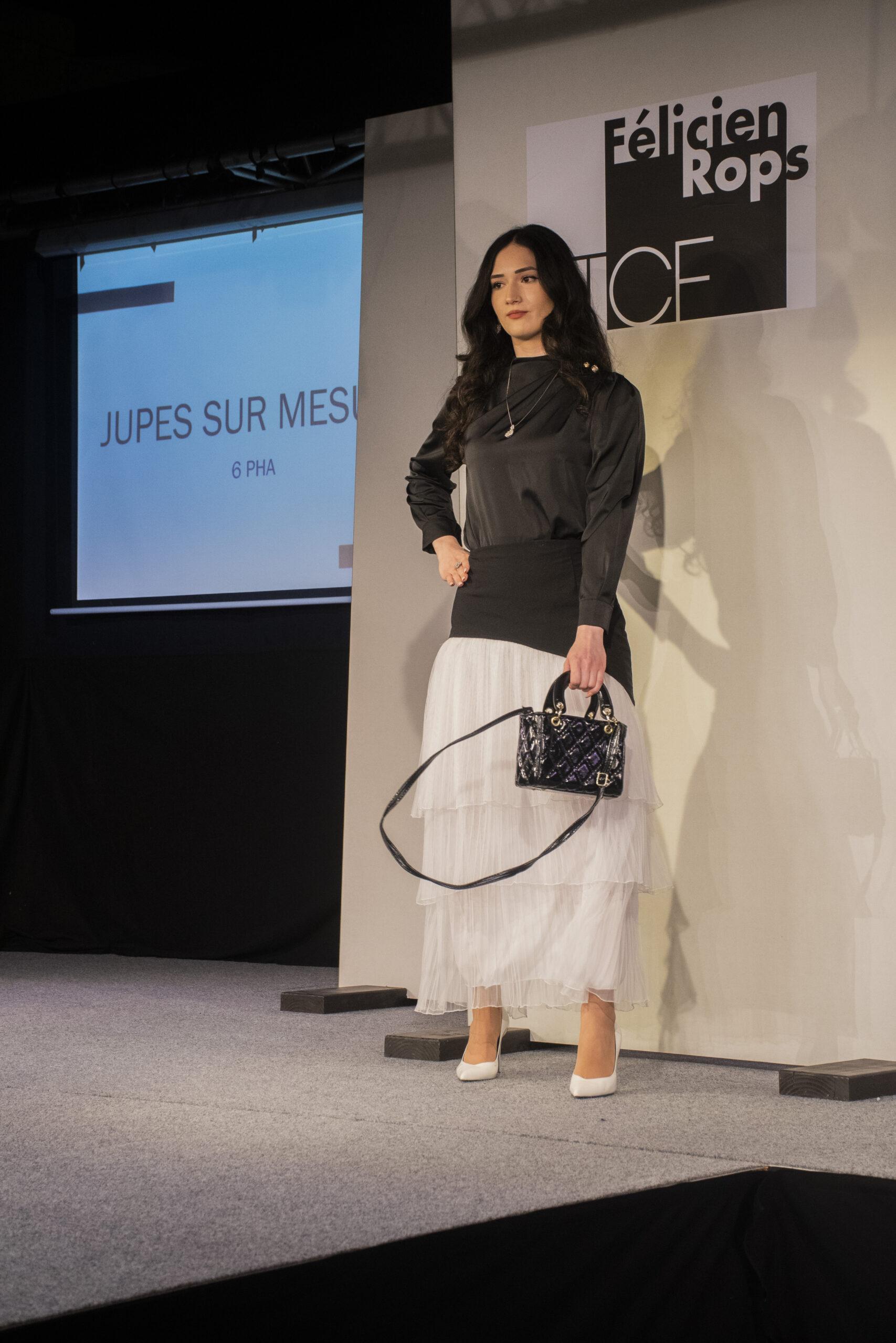Ce samedi 18 avril, notre Journée Portes ouvertes battait son plein : malgré une météo un peu maussade, il y avait du soleil dans les yeux de l’assemblée qui a assisté au défilé concocté par les professeurs et les élèves des sections « agent(e)s qualifié(e)s en confection » et « complément en stylisme » ; un immense merci aussi à nos collègues de la section « coiffure » de l’ITCF Henri Maus, toujours fidèles au poste pour accompagner et enjoliver notre projet.